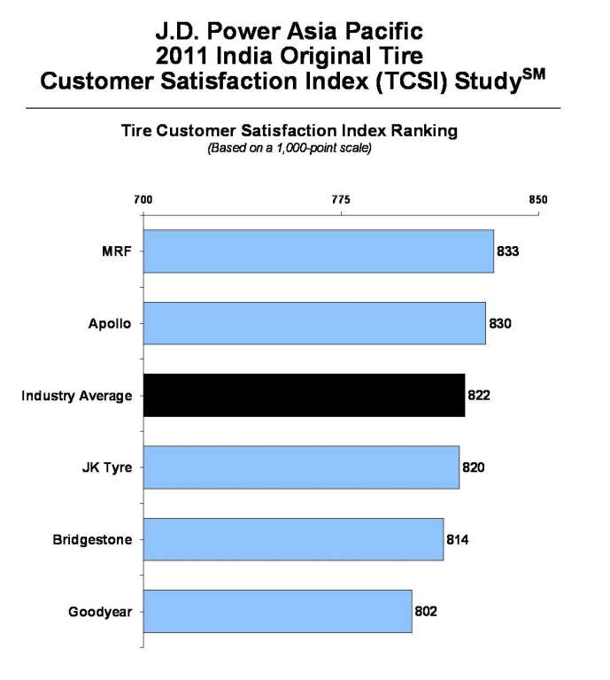 J.D. Power Asia Pacific 2011 India Original Equipment Tire Customer Satisfaction Index (TCSI) StudySM has revealed MRF to be the most satisfying OEM tire company in the country. The study, now in its eleventh year, measures satisfaction among original equipment tire owners during the first 12 to 24 months of ownership. The study measures overall satisfaction by examining four factors (listed in the order of importance): appearance, durability, traction/handling, and ride. Overall satisfaction in 2011 averages 822 on a 1,000-point scale, an improvement of 24 points compared with 2010.