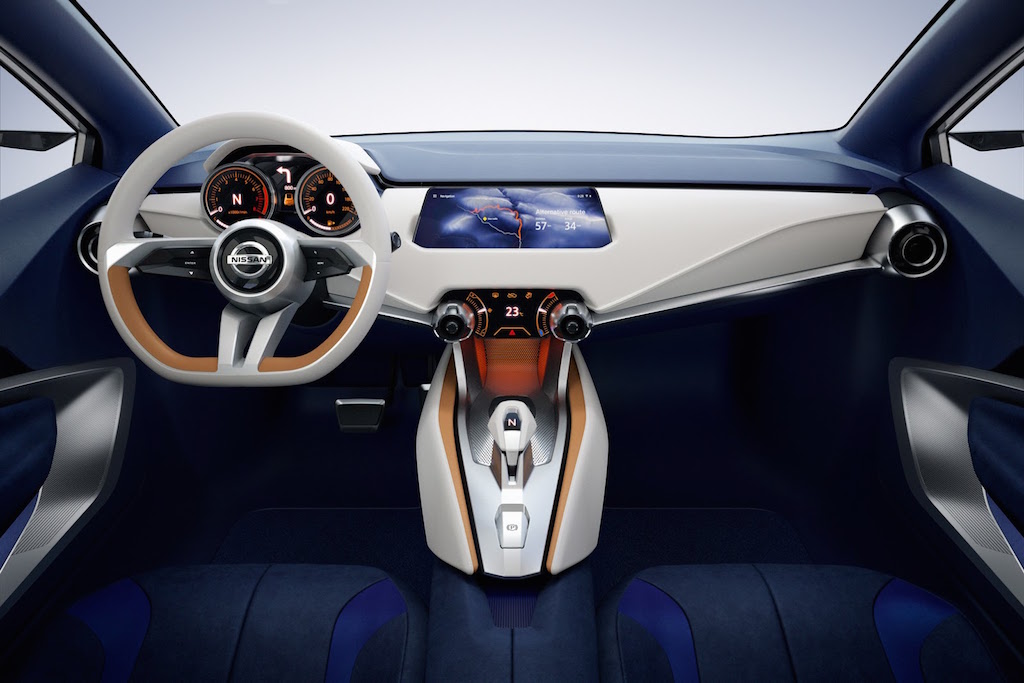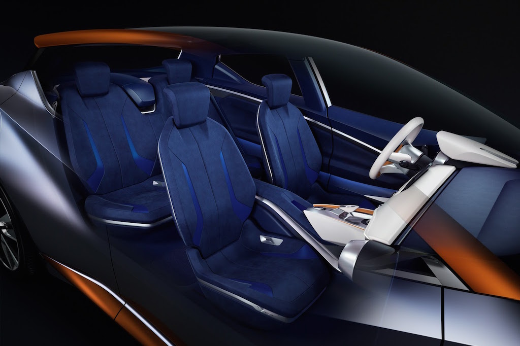 On the inside, the Nissan Sway concept has been inspired by the older IDx concept and gets flat bottom steering wheel, gliding wing-shaped dashboard with integrated display unit and two large rotors for climate control. Finished in white and orange with brushed aluminium all across, the angular lines are also visible inside the cabin and do complete justice to minimalism. The Sway concept also comes with a floating roof expressed by the panoramic sunroof, another Nissan feature.