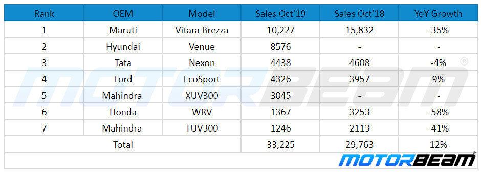 – The Maruti Brezza tops the list after selling 10,227 units in October 2019