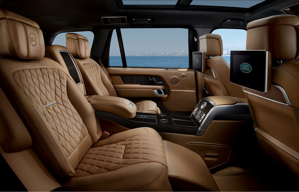 The long-wheelbase Range Rover SVAutobiography Ultimate edition features Vintage Tan leather interior trim and copper weave carbon fibre finishers, reclining heated and cooled semi-aniline leather rear seats, hot stone massage function, plus calf and footrests for rear occupants, power-closing rear doors, refrigerated compartment, deployable tables and a centre console with integrated Zenith timepiece.