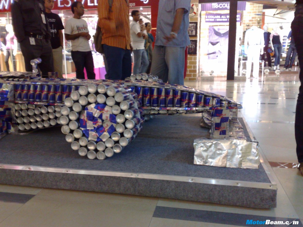 While Sebastien Vettel is busy partying post winning the Japanese Grand Prix, we thought of bringing you exclusive pics of his Red Bull F1 car. Only thing being, its not the car he used to win the race yesterday. The Red Bull race car you see in the pictures doesn’t have an engine, heck it doesn’t even have a steering wheel and is made using Red Bull cans. Yes, only Red Bull cans. A Formula 1 racing car costs around Rs. 1 crore but a Red Bull can costs Rs. 75/- Considering the amount of cans used, this fake F1 car doesn’t come cheap.