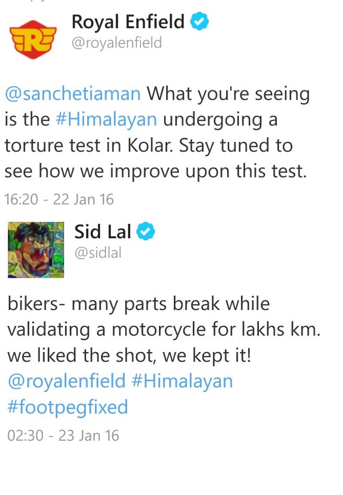 The video showing CS Santosh put the Royal Enfield Himalayan through its paces shows him jumping off a bump and the right side foot peg breaks when he lands. Screenshots of the same were taken and the same spread across faster than light. However, the company was fast to react on social media and ensured that the part breaking was a part of torture testing and that it has been replaced on the production version. Not only this, the company’s CEO, Mr. Siddharth Lal who himself has been very involved in the whole process took to Twitter to inform that the foot pegs have been fixed.