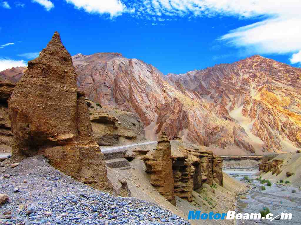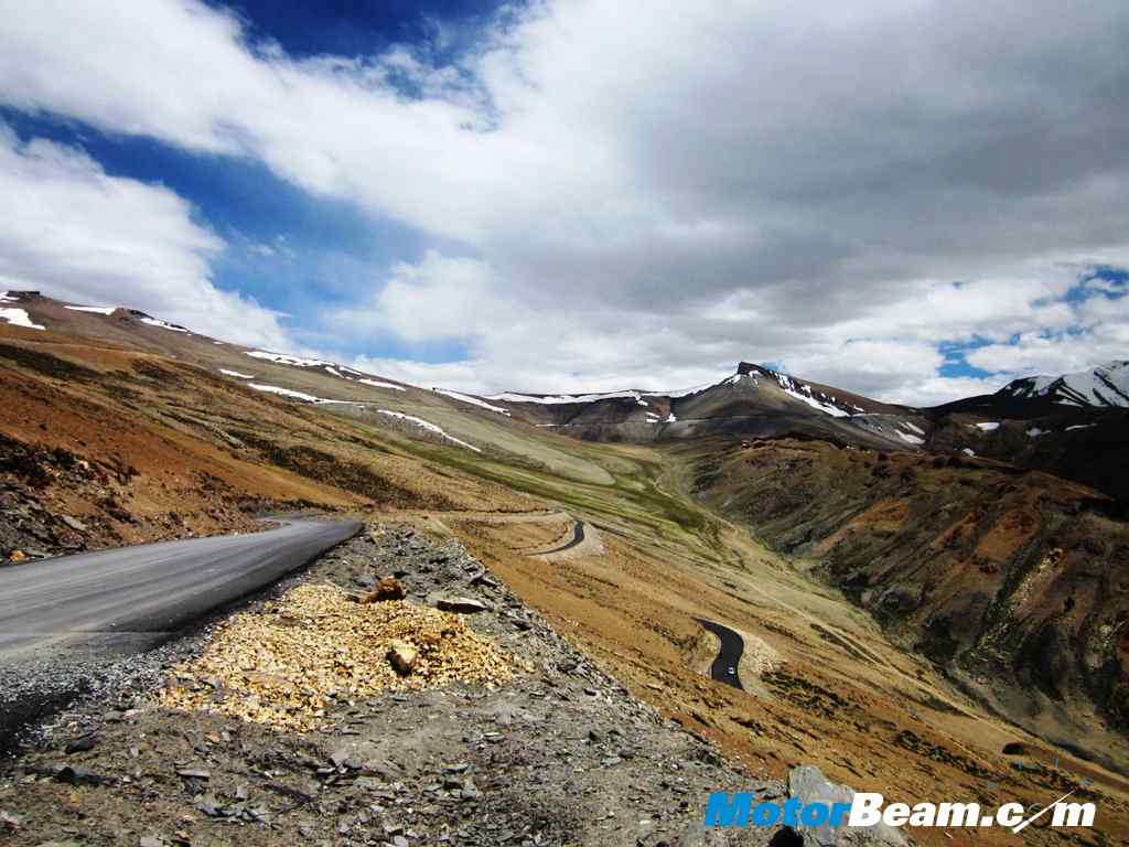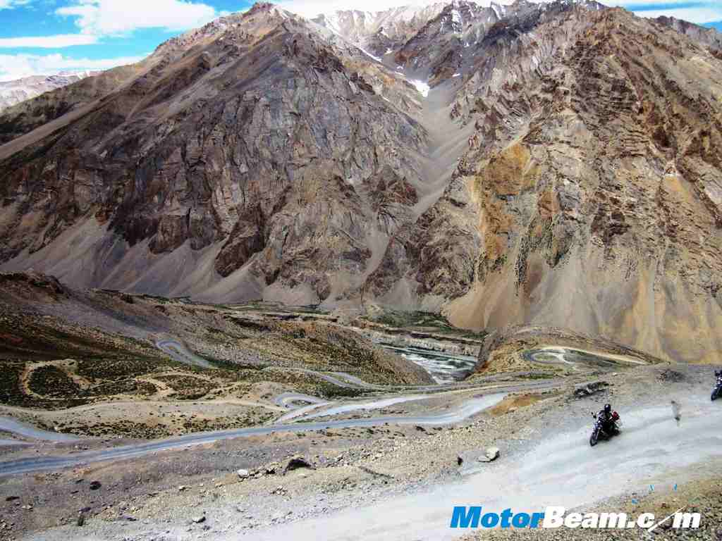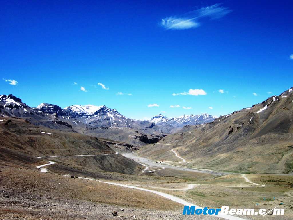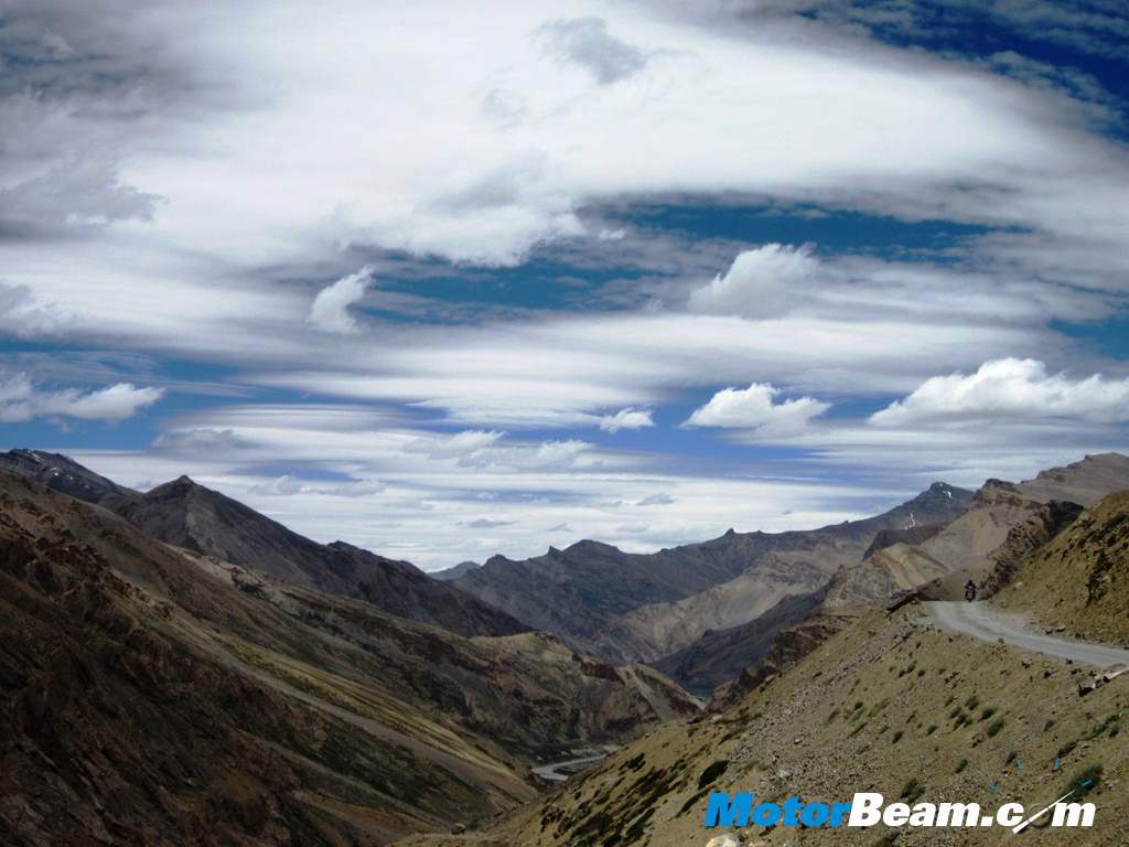 Next morning after thawing frozen fingers, toes and noses, luggage was packed, both petrol tanks and tummies were fueled up and we set of to the long ride to the town of Keylong which lay 230 kms away and 6000-feet lower. Just a few kms later we crossed the beautiful More plains which is a massive area of flat ground on the mountain at an altitude of about 14,000-feet. At the end of that came a beautiful valley with a river and amazing rock formations on the barren mountain sides. Then the descent to the town of Pang began which was an amazing road with many hairpin turns and decent tarmac and grand views.