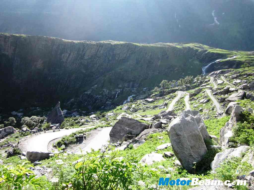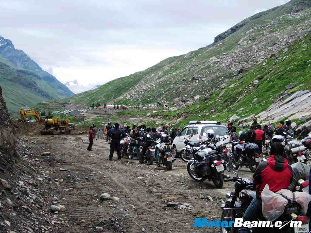 A big truck was perched at a spot where the earth had given way below it on the valley side. Apparently the road at the spot was being repaired and the truck was instructed to stop till the work was completed. But the impatient driver just decided to ignore that and drove on. As soon as he reached the spot, the road started falling apart underneath, the truck slipped about a bit and got stuck against the mountain on one side and a big hole on the other. Luckily the front and back wheels still had stable ground underneath them with most of the road in between gone. We were stranded and the worst part was two of our three leaders along with five more participants had overtaken the truck and were on the other side. As the connecting road between Kaza and Chandigarh had been completely closed down there was no way out for the seven people ahead but to come back via the same route. After a wait of 3 hours it was finally decided that the rest of the convoy would go back to the main road and go to Manali via Rohtang Pass and the ones stuck ahead would continue to Kaza and return to Manali as soon as this road block was cleared. So the rest of us turned back going through the same road. We joined the main road and gunned it down via the Rohtang pass towards Manali.