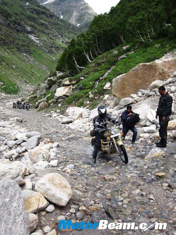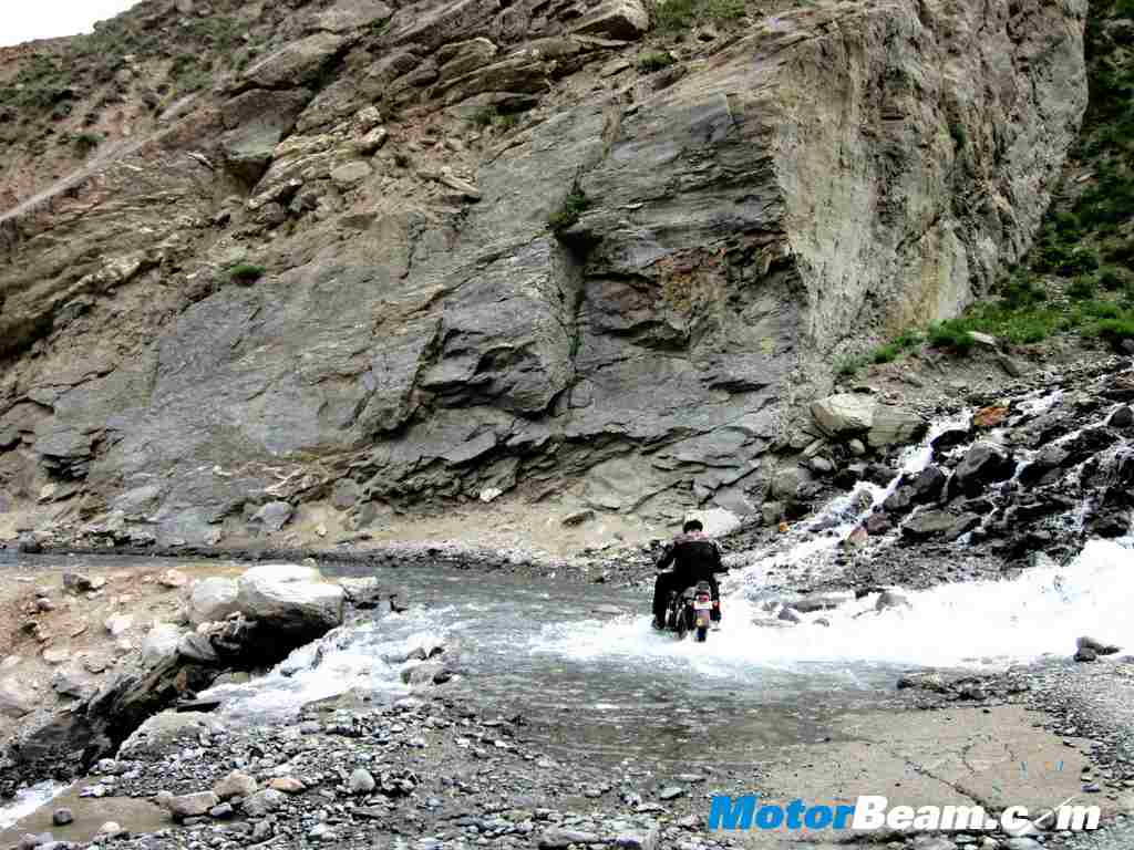 The next morning after breakfast and fuelling a general feeling of excitement prevailed in the group as we were briefed about the day, and were told that it would be one of the toughest days of the Odyssey with a whole day of riding on practically no roads, in place of which would be a selection of rocks, mud, slush and lot of water crossings. We set off and immediately encountered a few water crossings. With the experience from the day before, these ones were dealt with more easily. Just as we were settling into the groove, the convoy was stopped in its tracks by a phenomenon that we had been pretty lucky not to encounter till now – landslides. The road was blocked but the Army and Border Road Organization (BRO) diggers were chewing through the wall of earth and boulders and the road was cleared in half an hour. We set off again and within a matter of 5 kms another landslide stood in the way. Being smaller, we were off again in 15 minutes and turned off the main highway to the aforementioned ‘no road’ road.