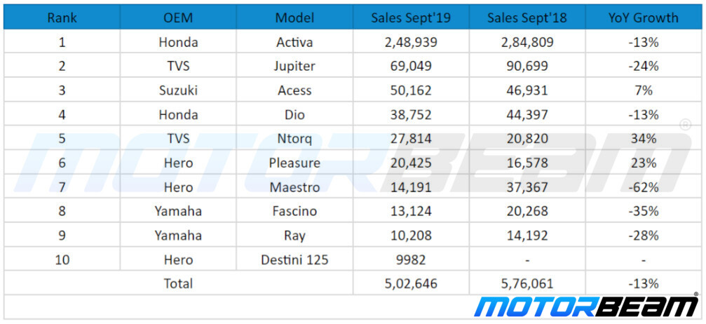 – Honda Activa retains the top position with -13% YoY