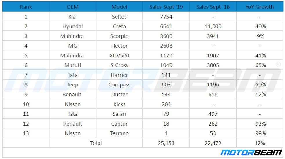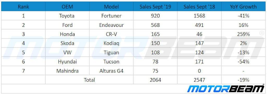 Galloping all the way up from just 46 units in September 2018, the Honda CR-V has sold 165 units to record 259% of growth. The Hyundai Tucson has recorded the steepest decline in the segment at -54% while the Mahindra Alturas G4 has managed to sell 75 units this month.