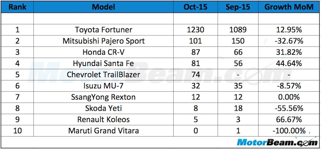 In the premium SUV space, the Toyota Fortuner continues to hold the pole position with 1230 units sold with a 12 percent increase in October 2015. The next best seller turned out to be the Mitsubishi Pajero Sport that clocked just 101 units, gaining a hike of 32 percent. The crossovers Hyundai Santa Fe, Honda CR-V and SsangYong Rexton clocked double-digit numbers, while the Skoda Yeti, Renault Koleos garnered single digit sales. Making its debut on the list was the newly launched Chevrolet TrailBlazer that sold 74 units in its maiden month. A tough competitor to the Fortuner, it will be interesting to see if the American SUV is able to hold its own against the Japanese giant.