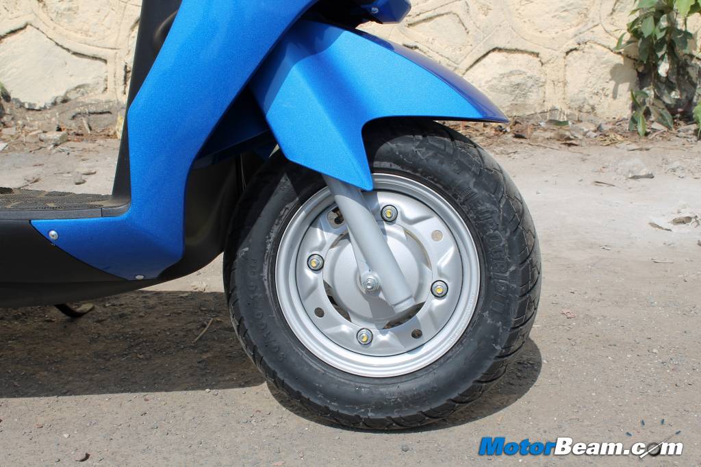 10-inch tyres get blunt steel wheels with the dimensions of the tyres being identical to its elder brother, the Swish