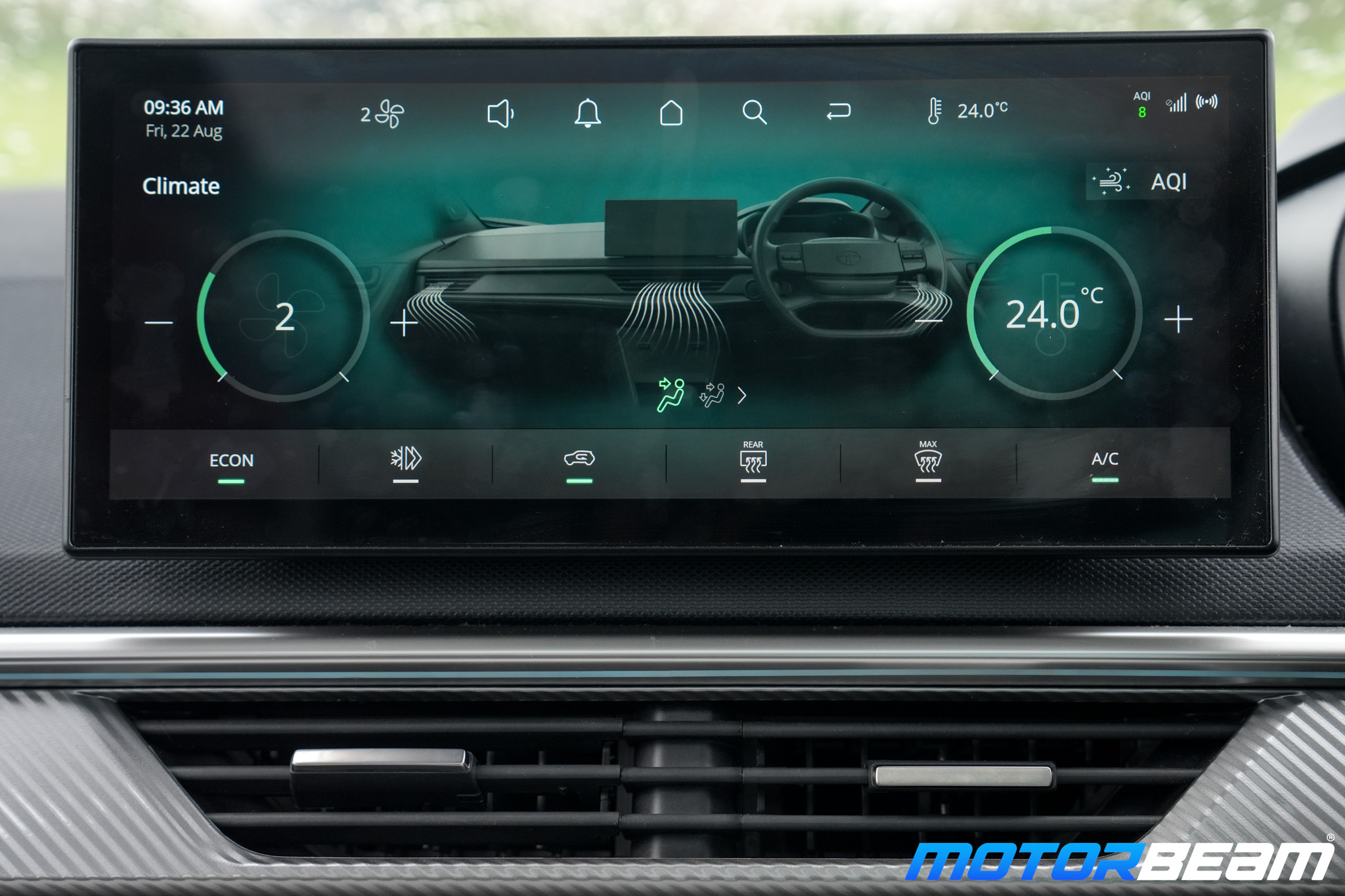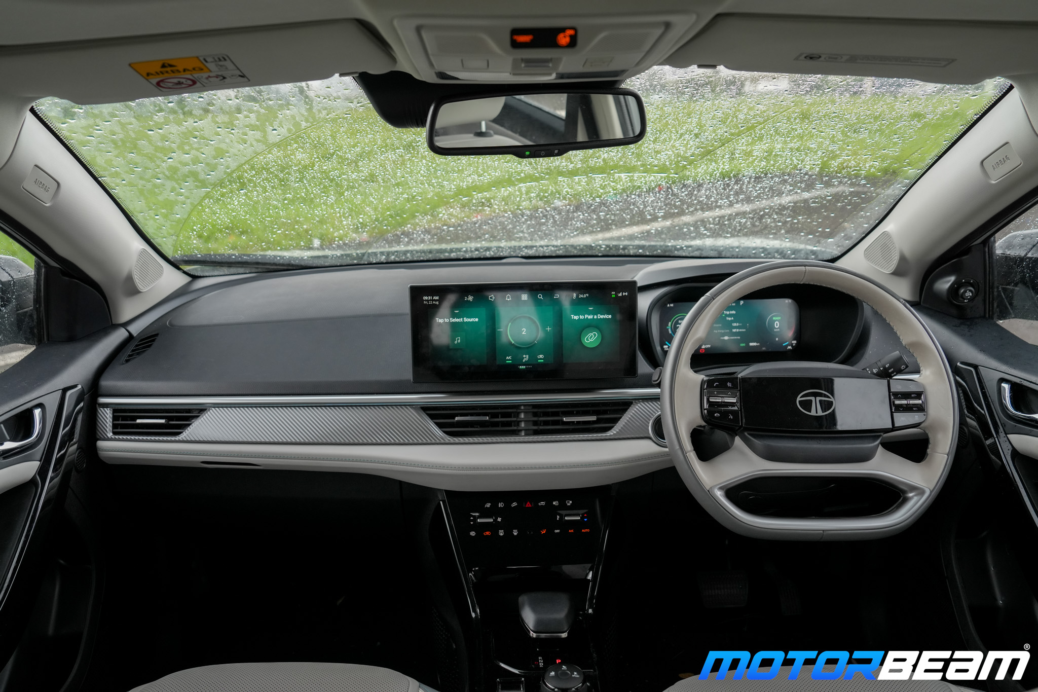 The cabin experience is similar to most of the modern Tatas of today. From the inside, the 4-spoke steering wheel and the textured trim below the AC vents are the only way to tell it apart from the Nexon EV. The light coloured interiors add a sense of space. The downside to that is it can get rather difficult to keep clean, especially during monsoons. The large 12.3-inch infotainment display is crisp and responsive but sometimes acts moody and does not let me connect my phone via Apple CarPlay. Having wireless Apple CarPlay is a must-have for many, which is available but I still stick to my trusty old wired connections.