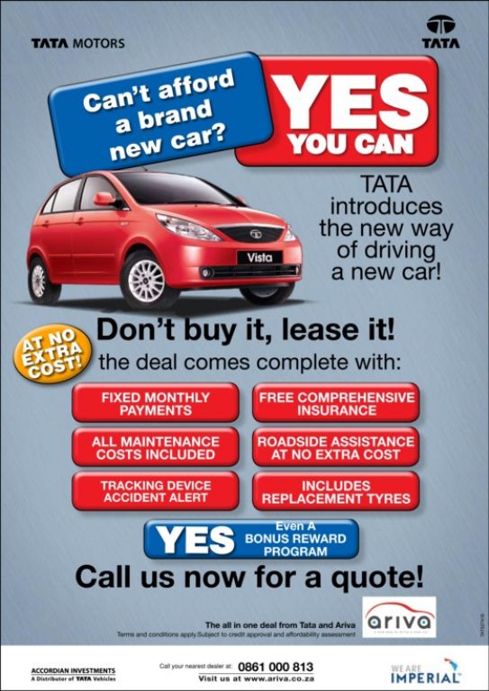 Tata Motors is offering the option of leasing the Indica Vista and at no extra cost in South Africa. The lease ownership includes fixed monthly installments, free comprehensive insurance, no extra maintenance costs, free road-side assistance, tracking device accident alert and replacement of tires. Tata is offering the leasing facility of their model the Vista Ego. The Vista Ego is sold in the African countries. Thus, this leasing option is not going to be available for the Indian customers as of now. But with Mercedes-Benz offering lease and BMW contemplating the same, could Tata Motors do the same with their not so hot selling cars like the Nano and the Aria?