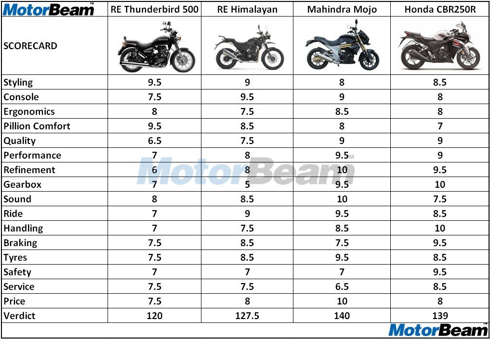 Ergonomics – The Mojo and Thunderbird have relatively similar riding postures, which is the standard tourer one. Undoubtedly long distances can be done without putting up much efforts but there are few differences in both of them. The Himalayan’s high ground clearance with handlebar position justifies it is an adventure tourer. The Himalayan is ruled out for short riders because of the same but for others it works out to be fine. Coming to the CBR250R, its riding posture is much different compared to the other three. The riding posture serves both city riding and highway touring. The crouching position may not be preferred by everyone.
