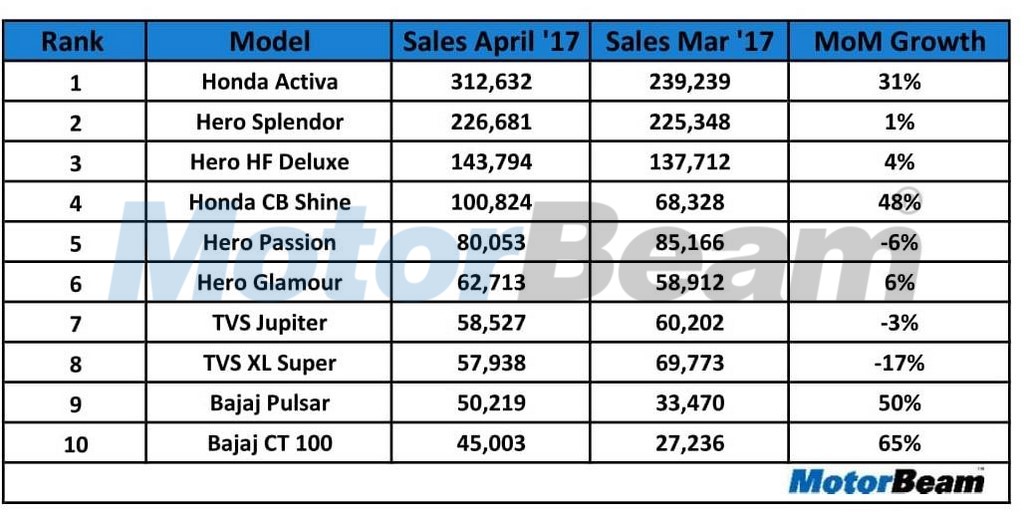 Honda Motorcycles and Scooters India and Hero MotoCorp continue to dominate the top 10 bike sales chart for the month of April 2017 too with the Honda Activa at the number 1 position selling 3,12,632 units and leaving the Hero Splendor behind by a big margin.