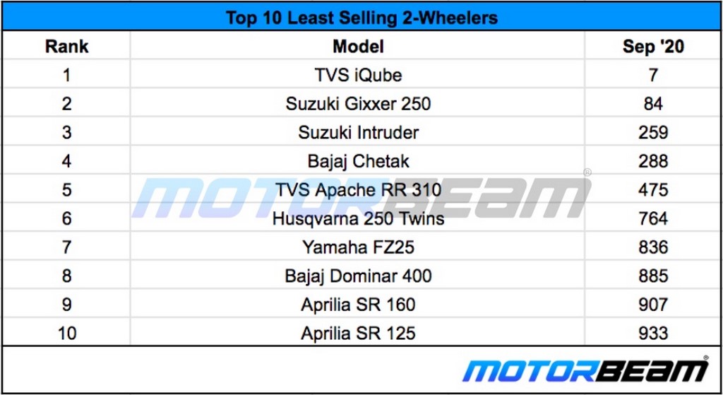 The least-selling 2-wheelers in September 2020 list is headed rather unfortunately by the TVS iQube.