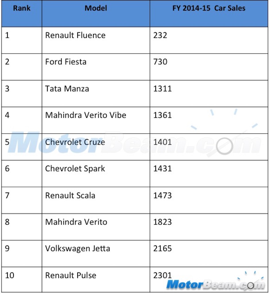 Renault managed to top the list with its Fluence D-segment sedan that clocked the least sales in FY2014-15 and also had the badge engineered Scala and Pulse making an appearance.