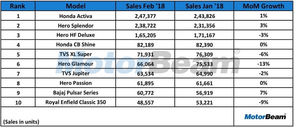 The top 10 selling bikes list for February sees the continuance of the dominance of the Honda Activa but the Hero Splendor is inching closer towards the number 1 spot.