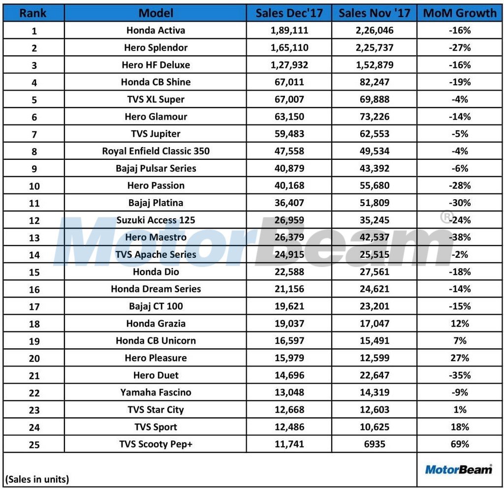 The Honda Activa leads the top 25 selling bikes in December 2017 list followed by the Hero Splendor.
