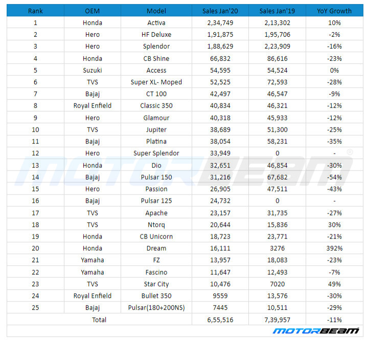 At number 4 stands the Honda Shine with sales of 66,832 units and a YoY of -23%. The second scooter on the list is the Suzuki Access with 54,595 units sold. The Access sold 54,524 units in January 2019, hence, the growth is almost negligible. Right behind the Access is the TVS Super XL- Moped with a 28% degrowth. The Super XL had sold 72,593 units in January 2019 whereas, it sold 52,525 units in January 2020.