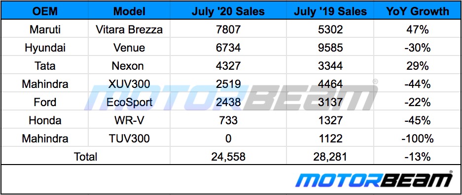 July 2020 compact SUV sales have surged when compared to June 2020 sales, but the overall figures are less than what was witnessed last year. But the gap is not huge this time around.