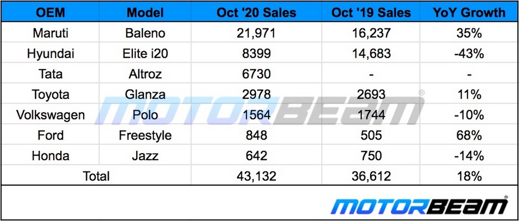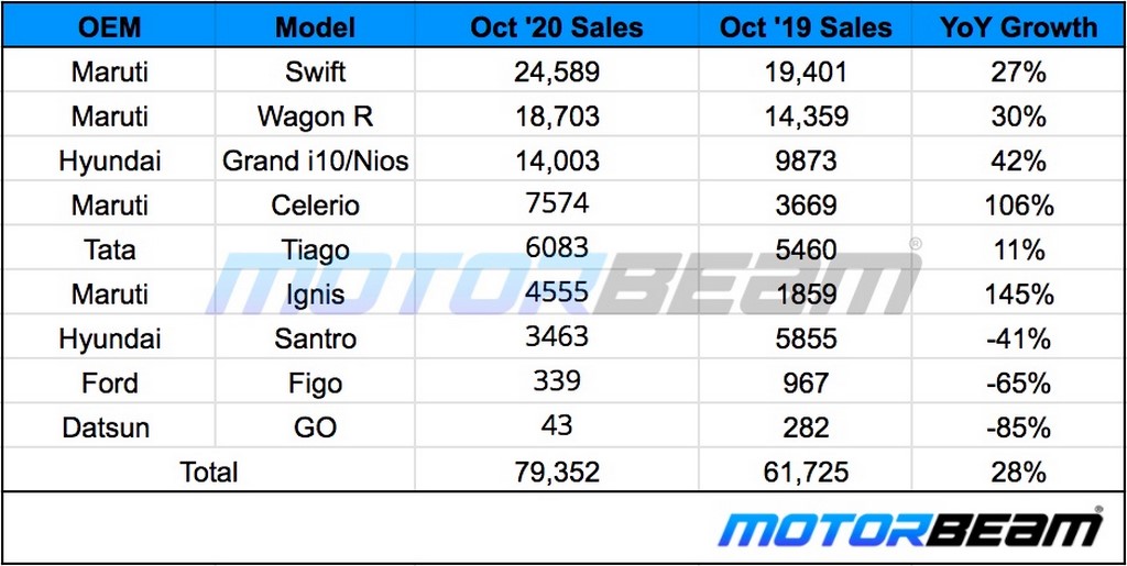 October 2020 hatchback sales is lead by Maruti products in all three segments of small cars, hatchbacks and premium hatchbacks.