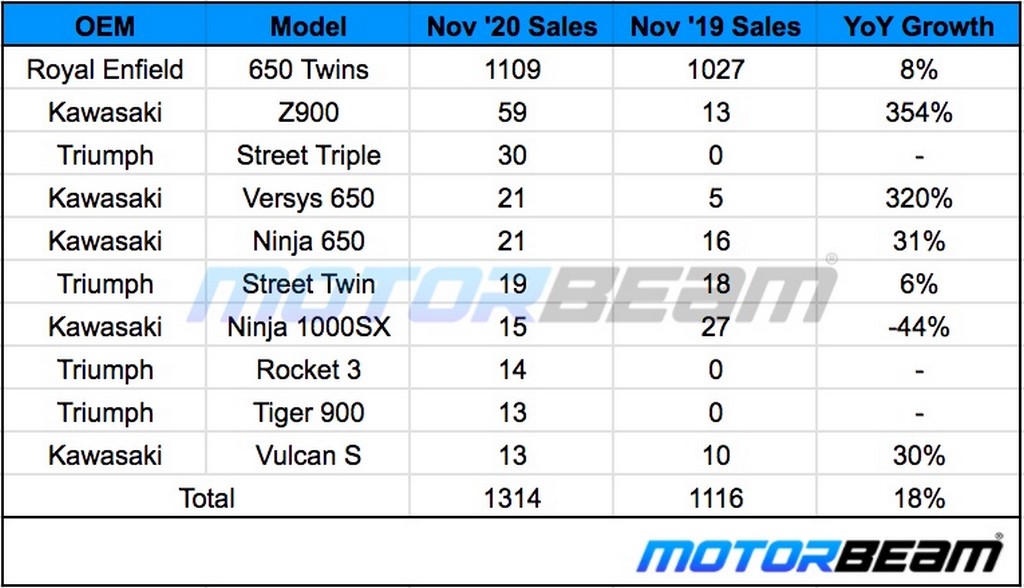Performance bike sales in November 2020 were up by 18 percent over the same period a year ago and once again the 650 twins from Royal Enfield were the biggest contributors.