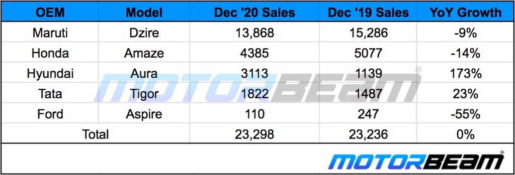 Compact sedan sales last month was eerily similar to the December 2019 sales figure and the segment is led by the Maruti Suzuki Dzire with 13,868 unit sales.