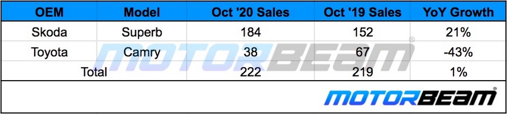 Finally in the October 2020 sedan sales, we come to the premium sedans where, once again, the Skoda Superb did better than the Camry, having sold 184 units, to the latter’s 38.
