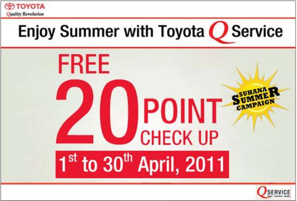 Toyota has announced the start of its yearly service campaign Suhana Summer in India. The service campaign will offer free check up for all Toyota models and will be conducted across Toyota dealerships from April 1, 2011 to April 30, 2011. The Japanese automaker has launched this service campaign in 122 dealerships across India. Under this campaign, all Toyota customers will be eligible for a free 20 point check up of their Toyota vehicles and an option to choose from a broad spectrum of service parts packages, which include most of the periodic and general maintenance repair related parts. All customers participating in the campaign by purchasing any of the packages will be eligible for over 3000 lucky draw prizes and a host of other assured gifts on various packages. Additionally, the Campaign offers Daily lucky draw for all walk-in chauffeurs at all its dealerships.