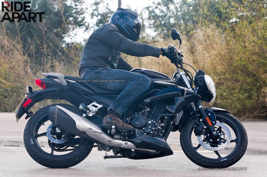 The upcoming Triumph bike will be constructed on a basic steel tube frame, which will be connected to a simple, box-section swingarm and will clench the liquid-cooled engine. The similarity of the design language with the Street Triple can be noticed in the bug-eye headlamps and the large exhaust canister. It has a rotund fuel tank, large one-piece seat unit and a plastic radiator shroud. A single disc brake and two-piston, slider calliper is held by RWU forks (no upside-down forks here). Hardware on the bike is quite basic.