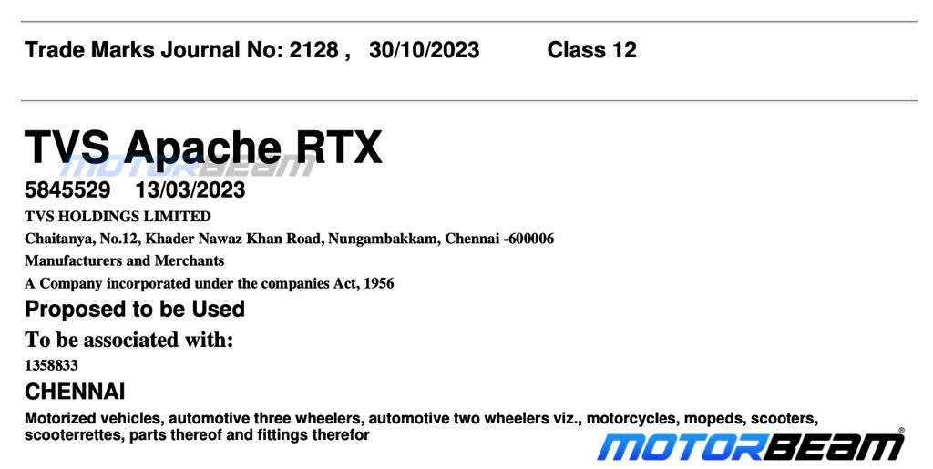 TVS Apache RTX trademark filed, Apache based adventure bike under development