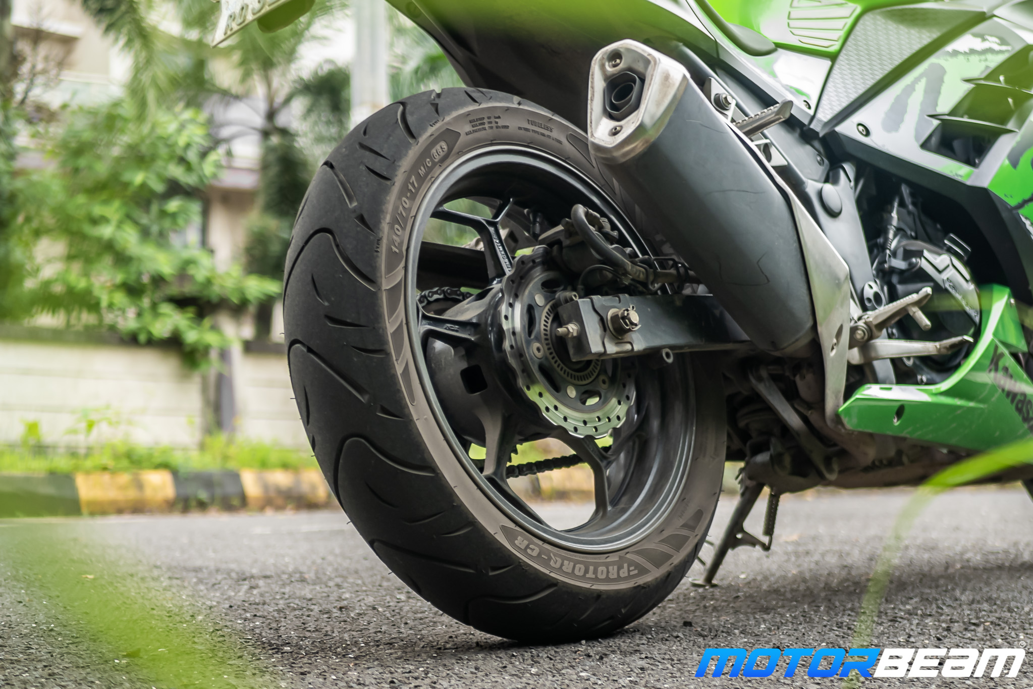 After riding the Protorq Extreme tyres on the Honda CBR250R, we were extremely impressed with the feedback and grip it offered. However, those tyres were actually made for the KTMs or the Apache RR 310 and were an upsize to the CBR. The set of Protorq Extreme tyres are meant for the race track while we wanted to check out if there is something more biased towards the street or rather long-distance touring. So, TVS Eurogrip has 2 tyre options for the 140-section rear rubber and we asked for the better-looking one. They also had another tyre which was a low-profile 140-section tyre but we rather got the CR, an actual fit to the Ninja 300.