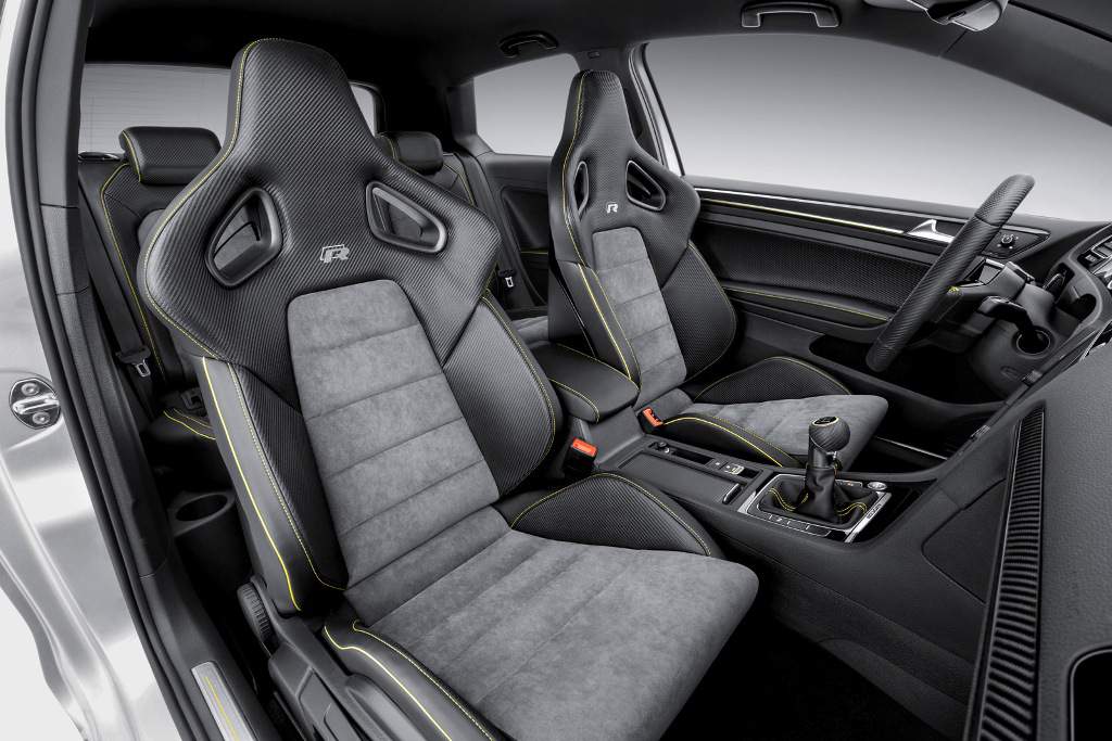 The Golf R400 concept is not very distinctively different from the Mk7 Golf. The hatchback has been lowered by 20 mm and sports 19-inch alloy wheels. The styling has been inspired with the wider wheel arches from the Golf G60 rally car. The R400 sports a rather stealth looking ‘Silver flake’ paint scheme with yellow accents all-over. Inside the cabin, the concept isn’t too drastically different from the production model, but sports extensive use of carbon and Alcantara leather with grey and yellow stitched sports seats.