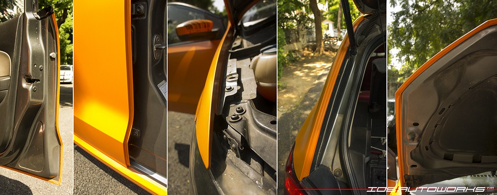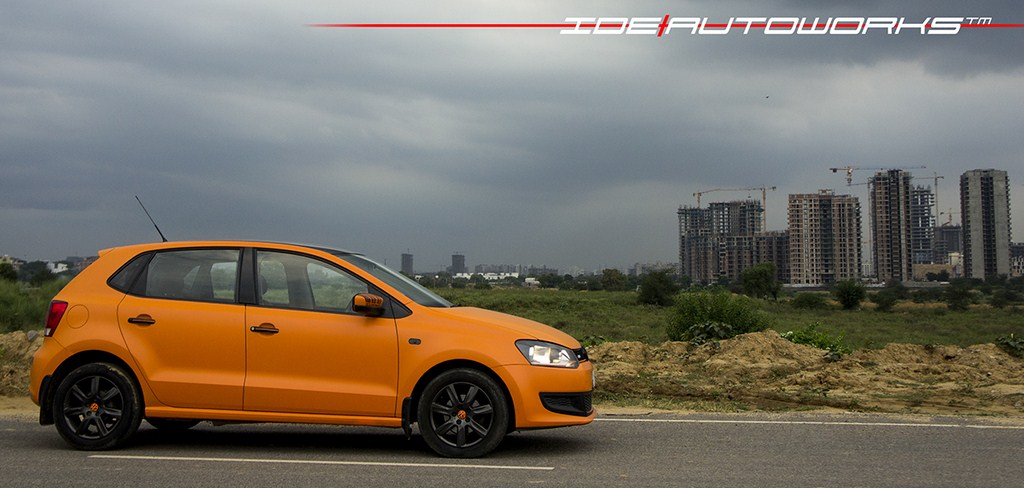 The rear profile of the Volkswagen Polo also gets a black finished VW logo. The number plate housing is finished in black as well and the lower part of the bumper gets a thin highlight of black. Overall, the car looks energetic and sporty with the matte orange cast vinyl wrapping. IDE AutoWorks is a certified 3M vehicle wrapping partner that offers roof wraps, full car wraps and printed racing stripes. Wrapping is done with a Scothprint removable vinyl that comes in high gloss colours, matte colours, brushed metal and carbon fibre finish. It is a less time consuming activity and cost-effective as well.