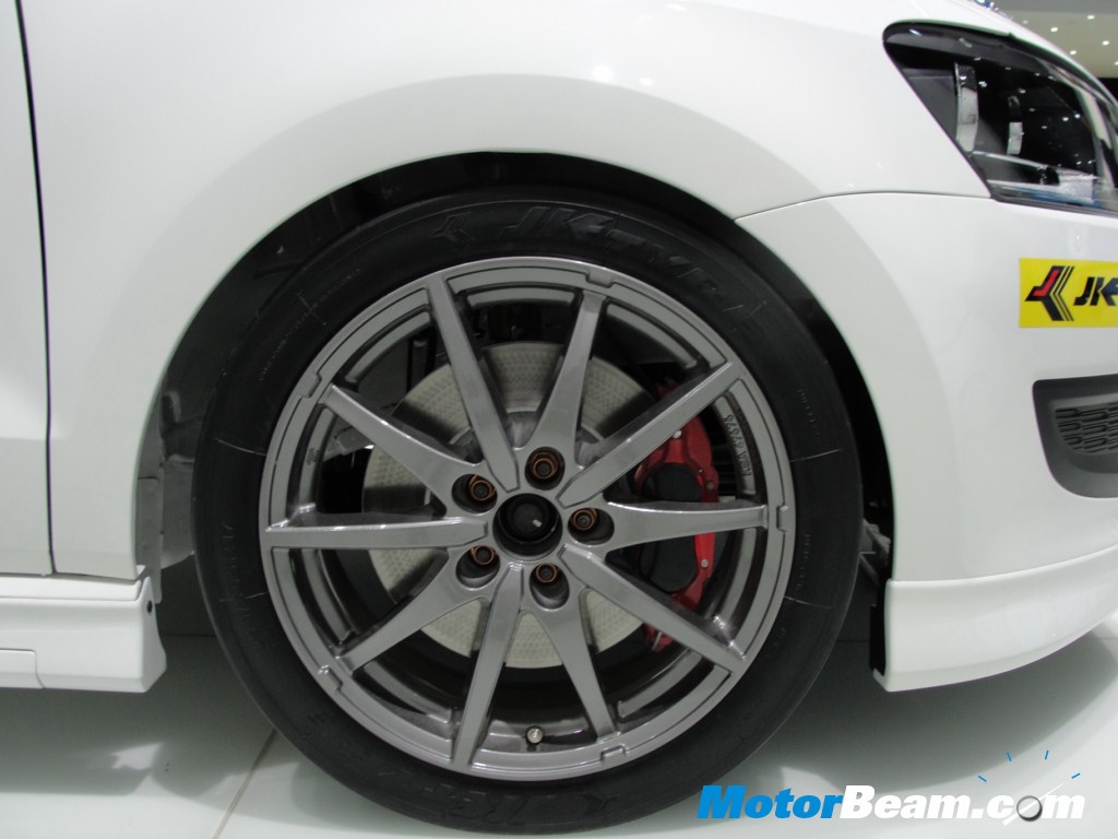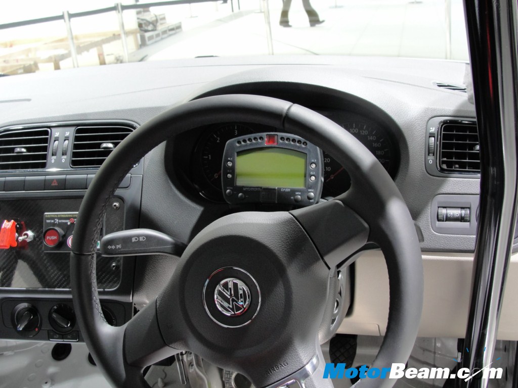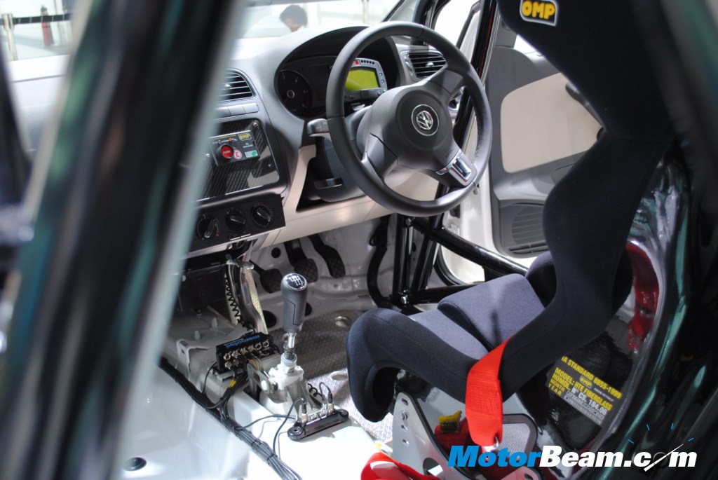 The interior is equipped with integrated head protection in the race seat, a 6 point seatbelt prepared for HANS System, safety net on driver side, additional display and data logger system with on board camera. Safety and security in the Race Polo is enhanced with the provision of FIA approved roll cage, fire extinguisher system with internal and external release, electrical cut off system and a race brake system with four piston fixed caliper and ventilated 312 mm disk front and 232 mm disc brake rear. In other words perfectly loaded and ready for the Race.