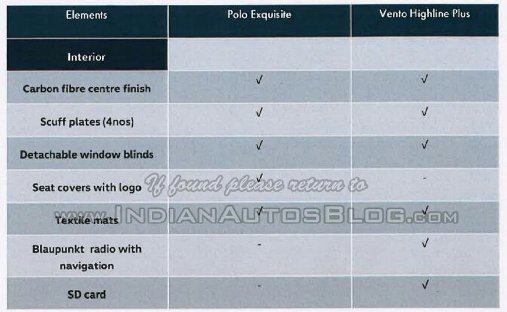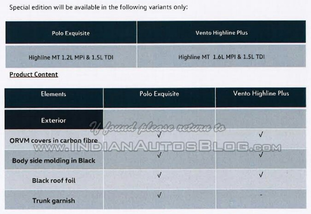 The Polo and Vento will get carbon fibre wrap for the ORVMs, black roof and black side body moulding. The Polo Exquisite will also get a chrome garnish on the tailgate. Both the vehicles also get scuff plates, carbon fibre finish on the centre console, removable window sunshades and fabric mats. The Polo also gets new seat covers with an Exquisite logo while the Vento gets a new Blaupunkt audio system with satellite navigation.