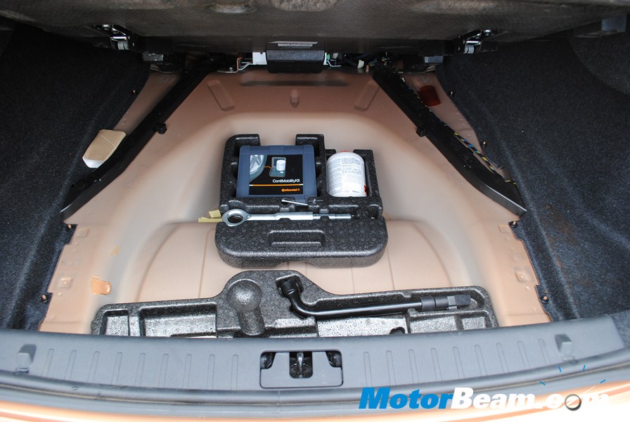 Lift the lid to check for a spare wheel and you will be shocked to find none. A Continental puncture repair kit sits pretty in there. Absolutely shocking. Indian driving conditions cannot do without a spare wheel or atleast runflat tyres.