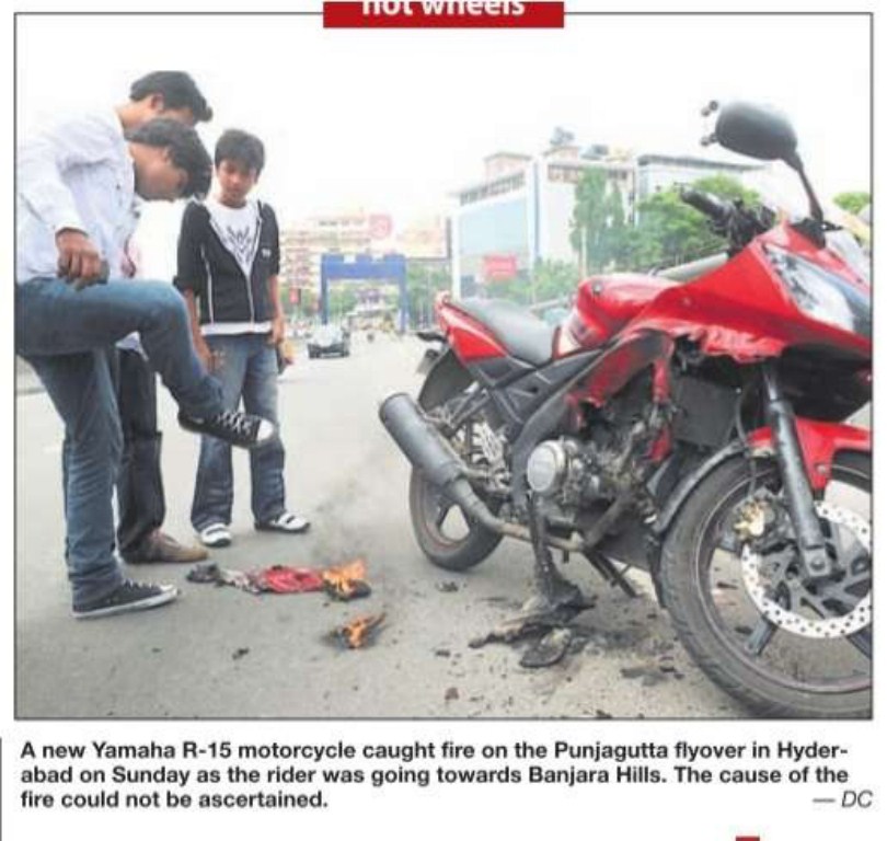 A Yamaha R15 caught fire in Hyderabad while the rider was negotiating a flyover. The cause of this fire still remains a mystery, with Yamaha officials opting to keep silent on this matter. The right side of the R15 was damaged by the fire, with the fairing charred. One of the possible reasons for the fire could be the leakage of fuel from the fuel tank or after re-fueling. Thankfully no one was hurt.